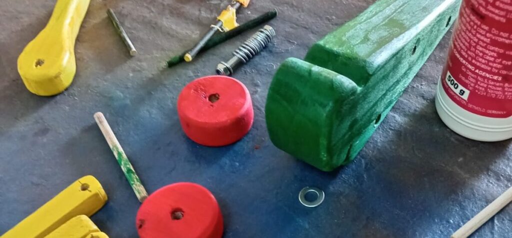 Die springkaan se bene beweeg op en af terwyl hy met ‘n tou getrek word.